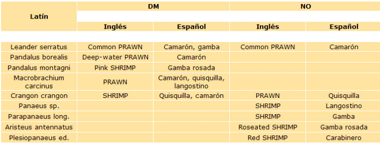 De estos crustáceos los mayores viven sobre el fondo (langosta, bogavante, etc.) y los menores (gamba, camarón, etc.) pueden nadar entre dos aguas, aunque algunos, como por ejemplo el langostino, se mantienen enterrados en arena durante todo el día y sólo salen de noche para alimentarse. Conviene advertir, al que quiera acudir a la bibliografía técnica, sobre la gran confusión que hay en los nombres vulgares de los crustáceos. Así para los ingleses no existen nada más que lobsters, mientras que nosotros distinguimos claramente entre langostas, bogavantes o lubrigantes y cigalas. Esta confusión llega a su punto álgido al tratar de las gambas, langostinos y similares, como puede comprobarse en el siguiente cuadro en el que, junto a las designaciones latinas, hemos anotado bajo las letras DM los correspondientes nombres en inglés y español según el «Diccionario Multilingüe», de la Organización de Cooperación y Desarrollo Económicos, y bajo las letras NO los mismos, según la «Nomenclatura Oficial Española de los Animales Marinos de Interés Pesquero», elaborada por el Instituto Español de Oceanografía. Ambos textos comparados son de evidente peso científico y reflejan por tanto la confusión existente, por lo que será necesario siempre al estudioso acudir a los nombres latinos para evitar errores.