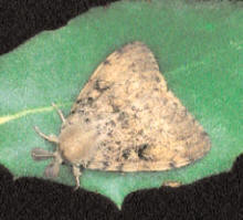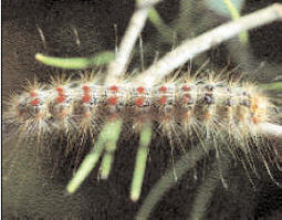 a oruga de los encinares (Lymantria dispar) ataca eventualmente a diversos frutales. Esta voraz oruga llega a medir de cinco a siete centímetros y presenta en el dorso seis filas de tubérculos (azules en los cinco primeros anillos o segmentos del cuerpo, rojos en los restantes), todos ellos con numerosos y largos pelos urticantes. Cuando nace mide solamente tres milímetros y es de color negruzco.