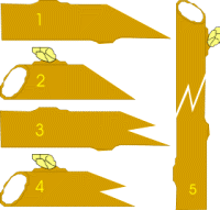 Injerto inglés: 1,2-Al patrón y al injerto se le practica un corte oblicuo; 3,4-Se vuelve a realizar una incisión a ambos pero en sentido longitudinal, profundizando unos 3 cm.; 5-Se acoplan patrón e injerto y se atan.