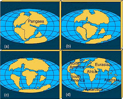 Ilustración de las fases de deriva continental: a. Hace 200 millones de años; b. Hace 130 millones de años; c. Hace 65 millones de años; d. Geografía actual