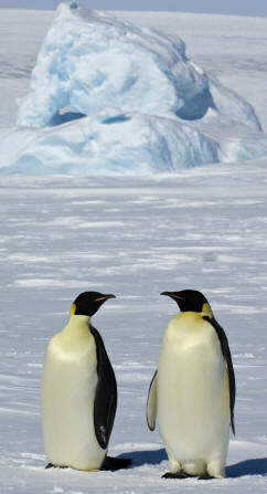 l pingüino Emperador es el supremo y más digno representante de todos los pingüinos. Pueden alcanzar la asombrosa altura de 120 cm., y pesar alrededor de 30 kg. Es de plumaje negro grisáceo en su zona dorsal y amarillento por debajo; cuello azul-grisáceo y parches anaranjados en las orejas; el pico es largo y ligeramente curvo en su extremo; las patas son parduzcas y emplumadas hasta su mitad.