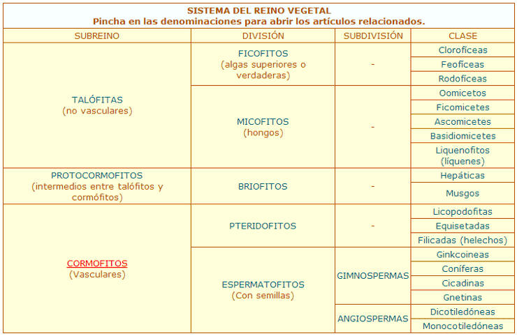 la clasificación del mundo vegetal, son las