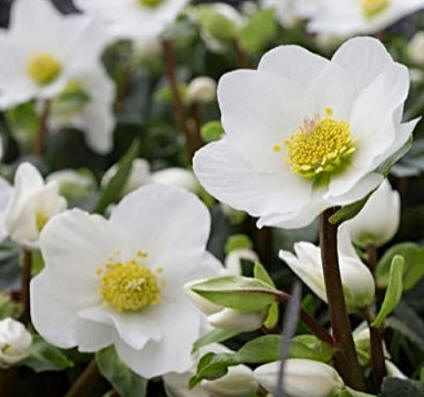 Las flores están situadas sobre largos pedúnculos, que aparecen coronados por dos o tres flores grandes (unos 8 cm), con cinco pétalos extendidos, blancos o rosados, y sépalos verdes que al final ennegrecen. La floración es abundante y permanece en la planta largo tiempo durante el invierno. Es una de las mejores plantas para flor cortada. Las flores deben cortarse cuando están abiertas.
