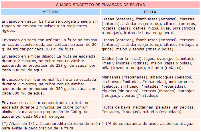 A continuación se describe un cuadro sinóptico de los métodos de envasado de las frutas para su congelación. Elija entre ellos según el tipo de fruta y/o aplicación que se le vaya a dar (entera, rodajas, gajos, etc.):