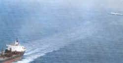 Un buque navega sobre la mancha de hidrocarburo que derramó otro buque (la estela de la mancha se abre a su paso)