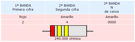 letra capitular Este es el sistema utilizado habitualmente para las resistencias axiales. Las bandas están dispuestas desde el extremo izquierdo hasta el centro, y se leen de izquierda a derecha. El color del cuerpo no se lee, y puede ser cualquiera que no confunda o impida leer correctamente las bandas de color laterales. Así, si tenemos las bandas de color rojo, amarillo, amarillo, el valor es de 240.000 ohmios: rojo=2, amarillo=4, amarillo=0000.