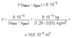 Un globo de goma tiene 8 g de masa cuando está vacío. Para conseguir que se eleve se infla con gas ciudad. Sabiendo que la densidad del aire es de 1,29 kg/m3 y la del gas ciudad 0,53 kg/m3 determinar el volumen que, como mínimo, ha de alcanzar el globo para que comience a elevarse.Para que el globo inicie el ascenso, la fuerza del empuje ha de ser superior a la del peso: