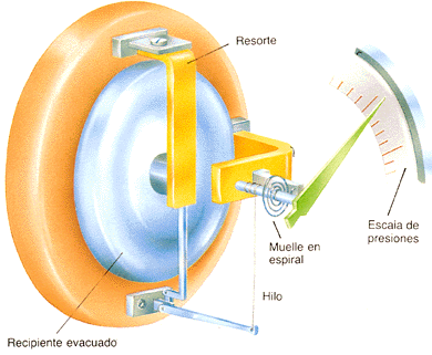 Por igual procedimiento variaciones en la presión atmosférica producen cambios en la forma de la caja que se transmiten al resorte y éste los indica, a través de un mecanismo de amplificación, sobre una escala graduada en unidades de presión.