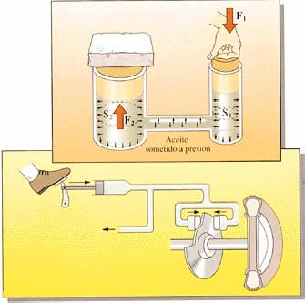 Si la sección S2 es veinte veces mayor que la S1, la fuerza F1 aplicada sobre el émbolo pequeño se ve multiplicada por veinte en el émbolo grande.