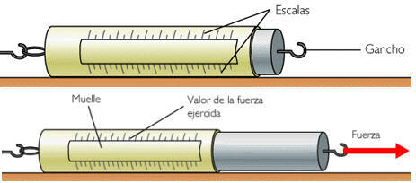 Si se ejerce una fuerza tensora de magnitud conocida en la dirección del muelle, el alargamiento experimentado por el muelle podrá representarse, en una escala anexa, por un número de divisiones igual al que corresponda a la magnitud de la fuerza expresada en newtons. Las deformaciones habrán sido graduadas de este modo en unidades de fuerza.