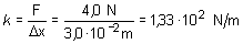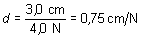 La proporcionalidad existente entre fuerza y deformación hace que se pueda razonar siguiendo una simple regla de tres. Si 4,0 N producen una deformación de 3,0 cm, la deformación que corresponderá a 1 N será: