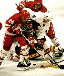 jockey sobre hielo chocan, cada uno de ellos sale despedido hacia atrás