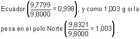 Suponiendo que la elección del aparato de medida ha sido correcta, el hecho de que la aceleración de la gravedad tome en el Ecuador el valor de 9,7799 m/s2 y en el polo Norte, 9,8321 m/s2 hace que un mismo gramo de masa pese más en el segundo lugar que en el primero. Si la báscula ha sido calibrada de modo que marque un gramo de masa cuando el peso del cuerpo en cuestión es de 9,8 · 10-3 N (P = mg), una cantidad de platino igual a la masa de un gramo medida con una balanza de dos brazos, será considerada por la báscula monoplato que aprecia hasta los miligramos como 0,998 g si la pesa en el