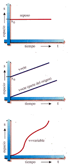 Se trata en este caso de un movimiento de velocidad constante en el cual el espacio recorrido es directamente proporcional al tiempo empleado en recorrerlo. Si la recta corta al eje s a una distancia so está coordenada representa la distancia que separa al móvil del origen 0, medida sobre la trayectoria, en el instante inicial. Una gráfica s-t curvilínea, o de pendiente variable, representará un movimiento de velocidad variable en el tiempo.Aun cuando en la gráfica s-t se represente el espacio, no es una gráfica espacial, es decir, no se trata de algo que pueda verse durante el movimiento, sino de una representación matemática que permite visualizar la forma en la que las variables s y t están relacionadas.