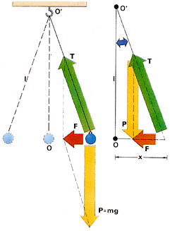 El movimiento de un péndulo simple es uno de los muchos movimientos naturales que pueden ser considerados como armónico simples. Para comprobarlo, es preciso efectuar un análisis dinámico del mismo. Las fuerzas que actúan sobre el cuerpo, supuesto aislado, son el peso P y la tensión T del hilo. La suma de ambas, efectuada mediante la composición del triángulo de fuerzas, dará lugar a la fuerza neta o resultante F.Si el hilo es suficientemente largo, la trayectoria curva de la bola al oscilar de un lado para otro puede considerarse como aproximadamente rectilíneo. Admitiendo tal simplificación, resulta que el triángulo formado por las fuerzas P, T y F es semejante al que forma la línea vertical por el punto de suspensión, la línea horizontal que paralela al techo pasa por el cuerpo, y la línea del hilo. Por tanto, de acuerdo con el teorema de Tales, de semejanza entre triángulos, se tiene: