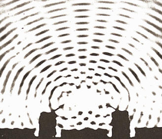 Imagen de interferencias en la superficie del agua que corresponden a dos focos que vibran con igual frecuencia. La resultante de la amplitud depende de la superposición de crestas y valles.