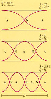 En los instrumentos de cuerda, una vibración aislada se refleja sucesivamente en cada extremo fijo de la cuerda -que en sí mismo no puede vibrar-, dando lugar a ondas que se propagan en ambos sentidos con igual amplitud y frecuencia, longitud de onda y velocidad. La superposición de ellas da lugar a un fenómeno diferente consistente en una vibración de la cuerda en su conjunto como si se tratara de un grupo de osciladores acompasados que vibran con igual frecuencia, pero con amplitudes diferentes. Los puntos en los cuales la amplitud es máxima se denominan vientres y aquellos otros en donde la amplitud es nula se denominan nodos. Todos ellos están en fase y la perturbación resultante no avanza de un extremo a otro, por lo que no hay transporte de energía a lo largo de la cuerda. Si no fuera por los rozamientos, la cuerda seguiría oscilando indefinidamente sin consumir energía y produciendo un sonido regular.La forma de las ondas estacionarias depende estrictamente de la relación entre la frecuencia o la longitud de onda y la longitud de la cuerda, pero además no todas las ondas estacionarias están permitidas, sólo aquellas que son capaces de satisfacer las condiciones que imponen los límites del medio, que en este caso al ser fijos no admiten perturbación. En la longitud total L de la cuerda ha de caber un número entero de medias ondas, o lo que es lo mismo, L ha de coincidir con múltiplos de l/2, tales como: