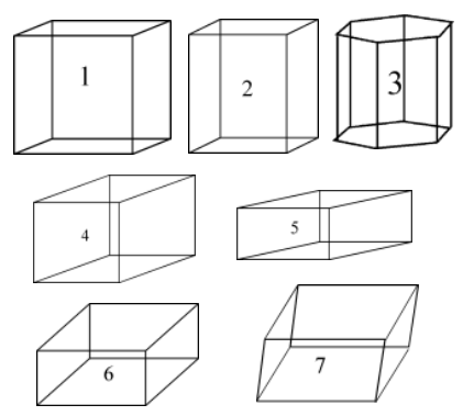 1-Cúbica o regular (3 ejes cuaternarios y 4 ejes ternarios); 2-tetragonal (1 eje cuaternario); 3-hexagonal (1 eje senario); 4-romboédrica o trigonal (1 eje ternario); 5-rómbico (1 eje binario); 6-monoclínica (1 eje binario); 7-triclínica (no tiene eje)