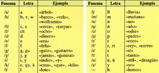 En el siguiente cuadro se incluye una relación de los fonemas castellanos y de las letras que los transcriben, y a continuación se indicará en qué consisten las principales discordancias entre fonemas y letras, y en qué circunstancias existen reglas que permiten una ortografía segura.