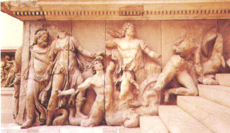 Nereo, Doris, Océano y Tetis, en un relieve procedente del gran altar de Pérgamo, perteneciente a los siglos 180-160 a.C. Museo de Berlín.