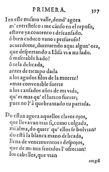 Poema de Garcilaso donde puede observarse una expresión lamentando la muerte prematura de su amada (...antes de tiempo dada a los agudos filos de la muerte!)