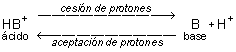 Los pares conjugados ácido/base se relacionan entre sí mediante los siguientes procesos de transferencia de protones, representados de forma genérica: