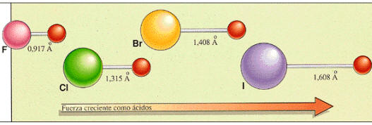 La longitud o la energía del enlace A-H determina la fuerza del ácido; cuanto mayor es el volumen del resto atómico A más alejado está el H y mayor es la facilidad de éste para desprenderse.