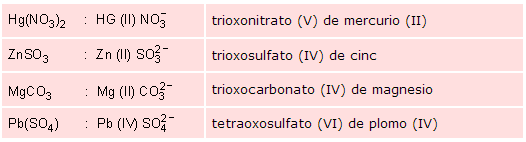 El nombre de las oxosales se forma anteponiendo el del anión poliatómico correspondiente al del elemento metálico, precedido de la preposición de y seguido del número de oxidación en el caso de que el metal pueda actuar con más de uno.