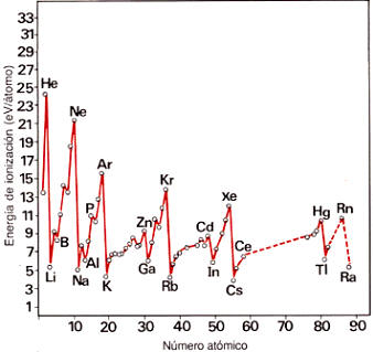 La representación gráfica de la variación de la primera energía de ionización con el número atómico da lugar a una línea quebrada repetitiva que refleja una cierta periodicidad. En ella los puntos de máxima energía de ionización corresponden a los gases nobles, lo que indica configuraciones electrónicas muy estables y explica su escasa reactividad química.