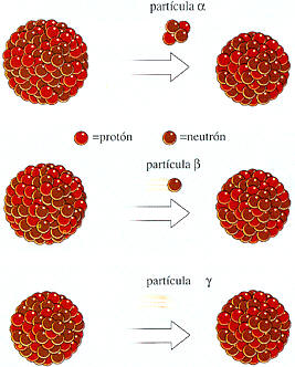 Estas transformaciones nucleares van acompañadas de la emisión de partículas a (núcleos de heIio 2He4), de partículas b (electrones -1eo) o de rayos y. En el primer caso, al pasar de un elemento a otro de la serie, el número másico A se reduce en 4 unidades y el número atómico Z en dos; en el segundo el número másico no sufre cambio alguno, pero en virtud de la conservación de la carga eléctrica el número de protones Z aumenta en una unidad; la desintegración b puede considerarse como la conversión de un neutrón en un protón y un electrón, de ahí que A no varíe, pues aunque Z aumenta en una unidad, N disminuye en igual cantidad. La emisión de rayos y, al tratarse de radiación electromagnética, no cambia ni el número másico A ni el número atómico Z del núcleo inicial.
