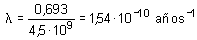 El periodo de semidesintegración T del 92U238 para la desintegración es 4,5 · 109 años. Calcular: a) La constante de desintegracióna) La constante de desintegración