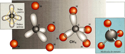 Los cuatro enlaces del carbono se orientan simétricamente en el espacio de modo que considerando su núcleo situado en el centro de un tetraedro, los enlaces están dirigidos a lo largo de las líneas que unen dicho punto con cada uno de sus vértices. La formación de enlaces covalentes puede explicarse, recurriendo al modelo atómico de la mecánica cuántica, como debida a la superposición de orbitales o nubes electrónicas correspondientes a dos átomos iguales o diferentes.Así, en la molécula de metano CH4 (combustible gaseoso que constituye el principal componente del gas natural), los dos electrones internos del átomo de C, en su movimiento en torno al núcleo, dan lugar a una nube esférica que no participa en los fenómenos de enlace; es una nube pasiva.