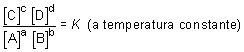 en la cual los coeficientes estequiométricos a, b, c y d que se obtienen tras ajustar la reacción, aparecen como exponentes de las concentraciones de reactivos y productos; K toma, para cada reacción, un valor constante y característico que sólo depende de la temperatura y que se denomina constante de equilibrio.