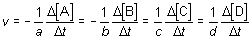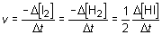 por cada mol de hidrógeno molecular H2 que se consume, se producen dos moles de yoduro de hidrógeno Hl; como ambos procesos se dan al mismo tiempo, la velocidad de aparición del producto es, en este caso, el doble de la de desaparición de uno cualquiera de los reactivos. La velocidad de reacción ha de ser única y viene dada por cualquiera de las ecuaciones siguientes: