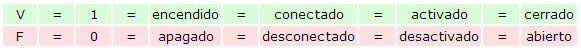 Verdadero (V) que equivale al "1" / Falso (F) que equivale al "0".
