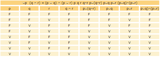 Comprobemos a modo de ejemplo una propiedad distributiva, utilizando una tabla de verdad con todas las combinaciones posibles.