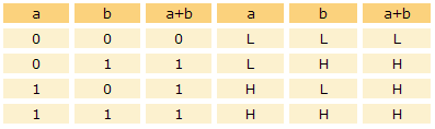 Lo que quiere decir que basta que una de las tensiones de entrada sea de nivel alto para que la tensión de salida sea de nivel alto (si asignamos el "0" al nivel bajo "L" y el "1" al nivel alto "H", lo que equivale a utilizar lógica positiva).