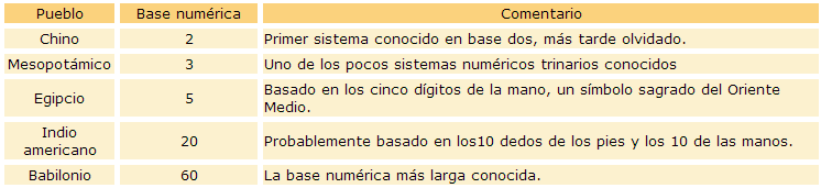 Se llama base de un sistema de numeración al número de símbolos diferentes utilizados. En la siguiente tabla se representan algunos de los más comunes: