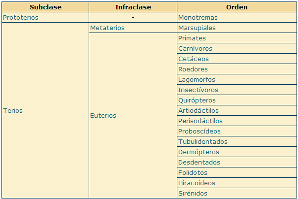 Los Metaterios son mamíferos con bolsa (marsupio), en el cual se desarrollan las crías (las llamadas larvas marsupiales). Estos animales no desarrollan placenta durante la gestación. Sólo incluyen un orden, el de los Marsupiales.Los Euterios son mamíferos placentarios, albergan a las crías durante el desarrollo, las cuales se alimentan a través de la placenta. Son los mamíferos que presentan los caracteres más evolucionados. Integra 16 órdenes: Artiodáctilos (cabras, ovejas, cerdos, jabalís, ciervos, renos, alces, jirafas, antílopes, hipopótamos, camellos, toros, gacelas, búfalos); Carnívoros (osos, tigres, lobos, zorros, focas); Cetáceos (ballenas, delfines); Dermópteros (lémures voladores); Desdentados (perezosos, osos hormigueros); Folidotos (pangolines); Hiracoideos (damanes); Insectívoros (topos, musarañas, erizos); Lagomorfos (liebres, conejos); Perisodáctilos (caballos, tapires, rinocerontes); Primates (monos y el hombre); Proboscídeos (elefantes); Quirópteros (murciélagos); Roedores (ratas); Sirénidos (vacas marinas, manatíes). Tubulidentados (cerdos hormigueros).