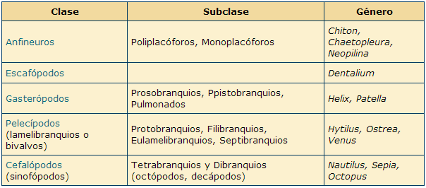 . Los anfineuros y los escafópodos tienen escasos representantes; por su parte, los gasterópodos, cefalópodos y pelecípodos, son muy abundantes en la actualidad.